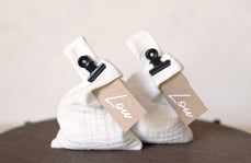Ons tetra knot zakje is een eenvoudige maar stijlvolle manier om je doopsuiker te verpakken. De zachte stof en de speelse knoop geven het zakje een natuurlijke en luxueuze uitstraling.